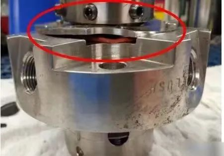 機械密封過壓會導致動、靜環(huán)密封面外徑處發(fā)生重力觸摸,并向內逐漸減小,直至簡直沒有可見的觸摸。高壓會導致主密封環(huán)外徑邊際呈現(xiàn)碎裂(缺口)。