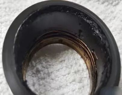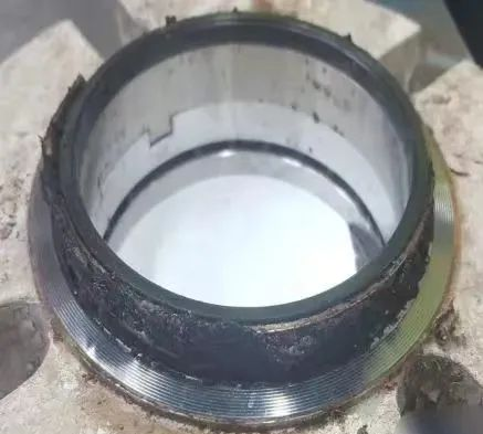 結焦會在機械密封的大氣側留下堆積物或研磨碎屑。當密封在過高溫度下運轉時,會呈現(xiàn)這種聚積物,但也或許是因為沖刷液不潔凈或外部環(huán)境帶來的污染等原因而呈現(xiàn)(見圖4)。